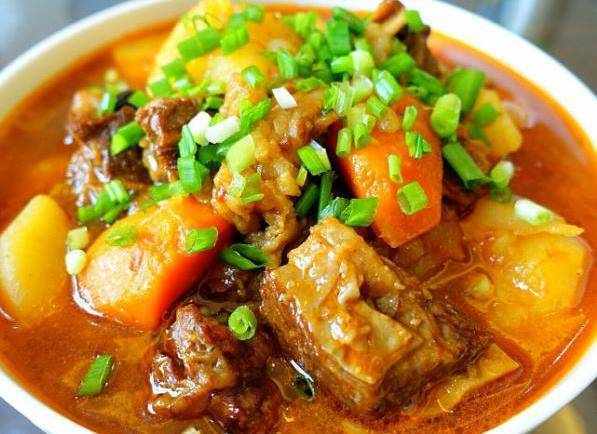 5、下入土豆塊一起燉煮,大約再燉煮20分鐘,牛肉軟爛,土豆耙糯即可。下入一點味精/雞精,出鍋再撒上一把蔥花就可以啦。