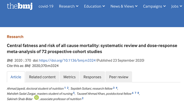 [2]Ahmad Jayedi,Sepideh Soltani,Mahdieh Sadat Zargar,et al. Central fatness and risk of all cause mortality:systematic review and dose-response meta-analysis of 72 prospective cohort studies[J]. bmj,2020. 370:m3324.