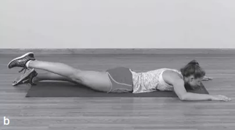 身體俯臥在瑜伽墊上,雙臂在身體兩側彎曲,利用臀部力量將右腿抬起,使大腿距離地面5- 8釐米。保持姿勢3秒,然後慢慢放下右腿,回到起始姿勢。接著用左腿重複一遍動作。