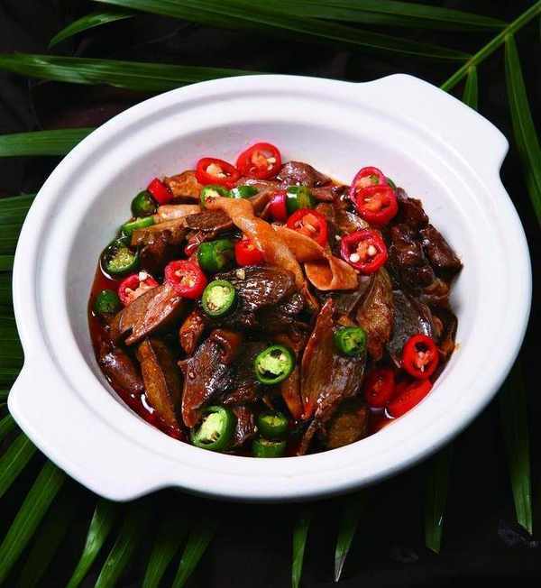 原料:鴨血500克,雞胗350克,鴨腸100克