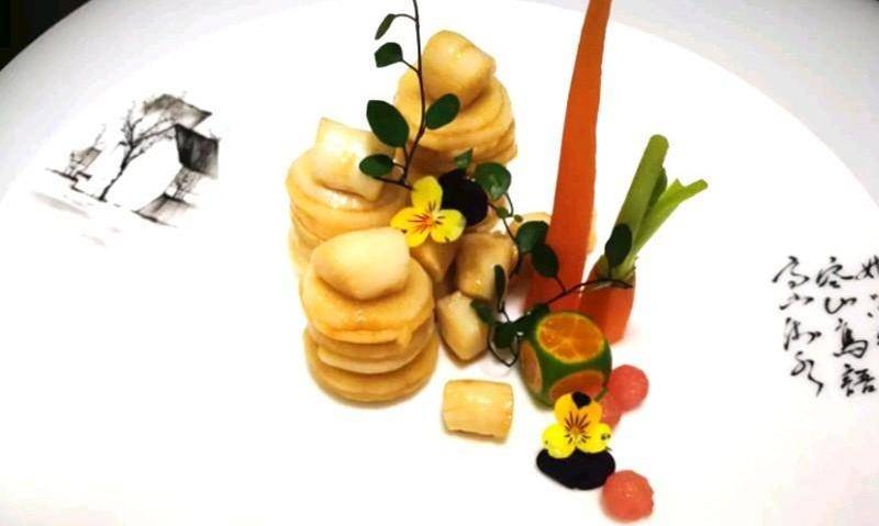 把處理好的蒜和扇貝組合裝盤,加入胡蘿卜、三色堇等點綴即可