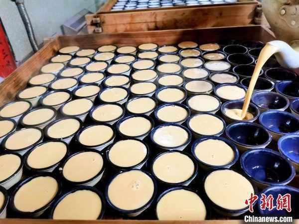 臺山市四九鎮五十墟飴香包點店每天炊制黃糖、白糖兩款傳統口味的“碗頭仔糍” 李曉春 攝