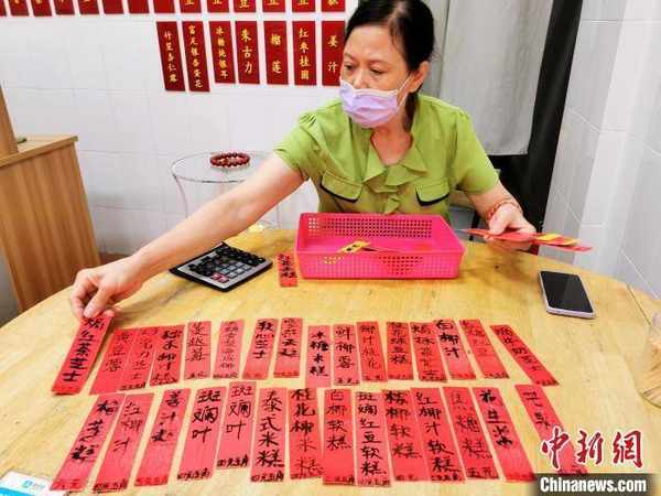 “五一”假期期間,在臺山市臺城街道西門墟設攤的“嬋姨靚粽”工作人員為顧客打包斑斕味缽仔糕 李曉春 攝