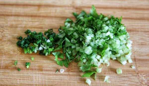 2、準備一點芹菜和香蔥,芹菜是廣東原味湯粉的關鍵,不能少,芹菜要買比較嫩小的,這樣做出來的湯粉才會清香有味。芹菜連同葉子一起切碎,香蔥也切碎備用。