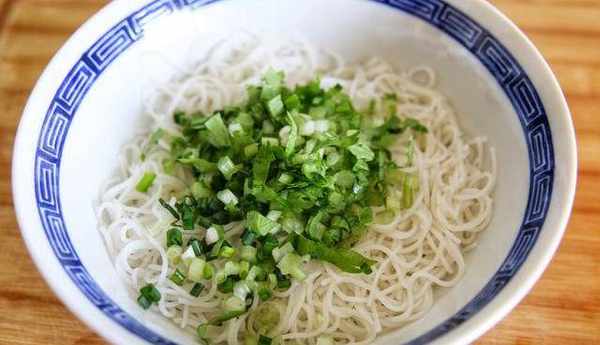 4、接著準備開水,放米粉燙熟後撈出,米粉不用燙太久,燙一分鐘就可以瞭,燙太久容易碎。再把米粉放入湯碗裡,再撒上較多的芹菜和蔥花。