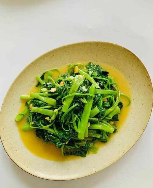 小燕還炒瞭一個清炒空心菜,分量很少,剛好夠一個人吃,將空心菜切成小段,鍋中加入一點點油,放入空心菜,炒幾分鐘,炒至斷生變軟即可,小燕放瞭一點豆醬在裡面一起炒的,金黃色的豆醬搭配綠油油的空心菜,還挺有食欲的,顏色搭配也很好看,小燕做的每一個菜調料都隻放瞭鹽,其他的調料基本沒有放。