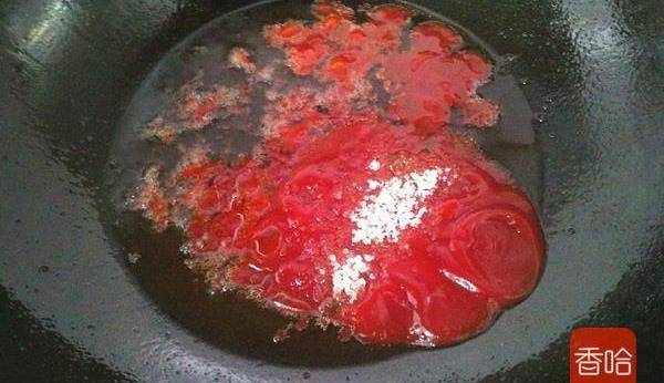 6.鍋內剩適量的油 放入番茄醬和白糖調制番茄汁