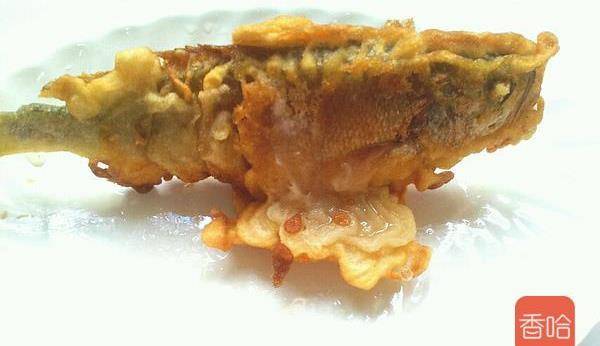 4.炸至金黃色後把魚盛出來放在盤子裡面 然後在弄一小勺面糊放入鍋內炸 在把魚放入 這樣魚就能和底座粘合在一起瞭