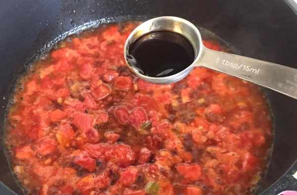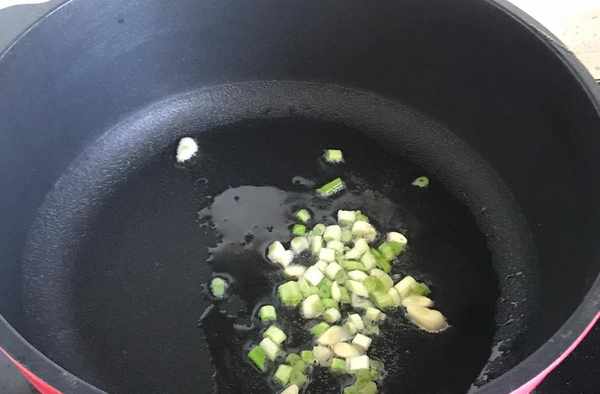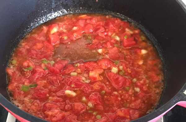 步驟四:起鍋燒油,把蔥蒜爆香,然後放西紅柿丁進去翻炒,要把西紅柿的湯汁給炒出來,放生抽蠔油調味,最後放適量的水煮開。