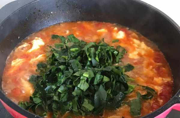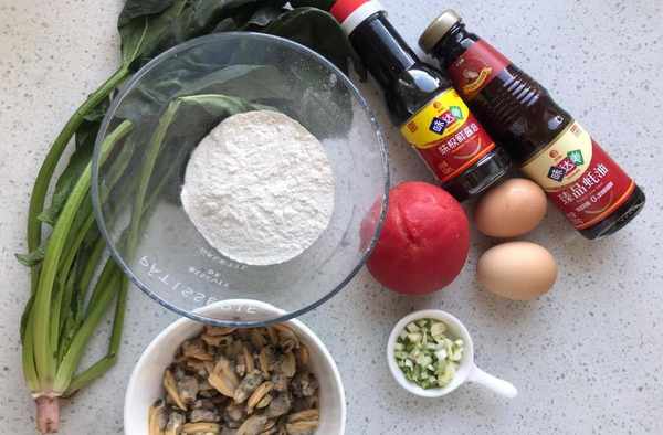 配料:蛤蜊500克,西紅柿一個,菠菜一把,雞蛋2個,面粉適量。