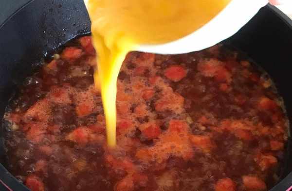 步驟五:煮開之後把雞蛋徹底地打散,然後倒入鍋中攪拌均勻,再次煮開之後就放準備好的面疙瘩。