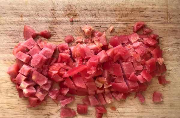 步驟三:西紅柿切丁,菠菜清洗幹凈之後切段,面粉加入少量的水進行攪拌,做成疙瘩的狀態備用。