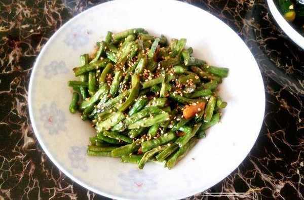 4.豆角炒幹後往鍋中放入適量的鹽、味精、味極鮮調味,然後倒入少量的開水,炒熟出鍋裝盤撒上芝麻即可。