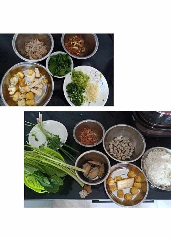 第1步:準備好所有食材,也可根據自己喜好增加或刪減配菜,將鮑魚、薑切片,肉切絲,菜心、芹菜、蔥以及香菜切段。