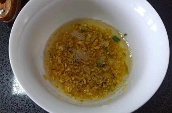 第3步:起鍋熱油,放入蒜末,一點點蔥白炸香後備用(粉湯美味精髓之處在於蒜油)。