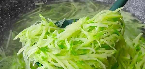 2、接下來鍋中燒開水,加入一勺食鹽。再加入一勺食用油,將擦好的蘿卜絲放入鍋中焯一下水,加鹽能去除蘿卜的辛辣味兒,還能使蘿卜吃起來口感更加的鮮嫩,加食用油能鎖住蘿卜絲裡邊兒的水分,營養不流失。焯水30秒就可以控水撈出來。直接放在涼水中過一下,涼水過涼可以使蘿卜的顏色更加翠綠。然後用手擠出裡邊兒的水分。也不要擠得太幹啦,保留一點水分,口感會更好。
