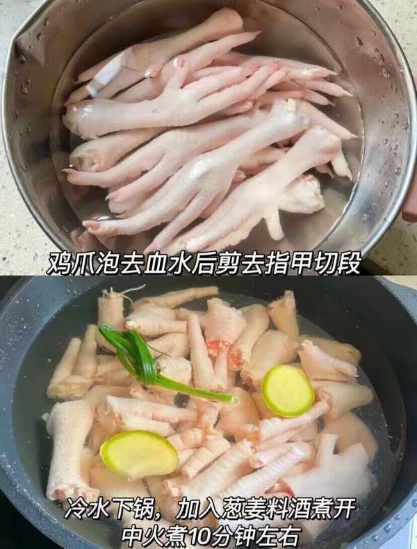 第一步:雞爪洗幹凈泡去血水後剪去指甲再切段,燒一鍋水焯下雞爪,放薑片、蔥段,大火煮開後轉中火在煮10分鐘。煮熟撈出放冰水中泡十分鐘,這樣是為瞭雞爪更q彈!