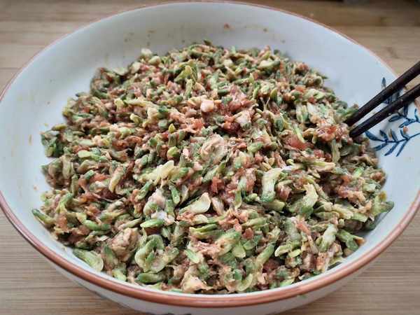 5、每次加入蔥薑水,用筷子攪拌讓肉餡吸收後,再次加入第二次,第三次加完後順一個方向攪勻,把肉餡攪上勁,接著放入槐花繼續拌勻成餃子餡