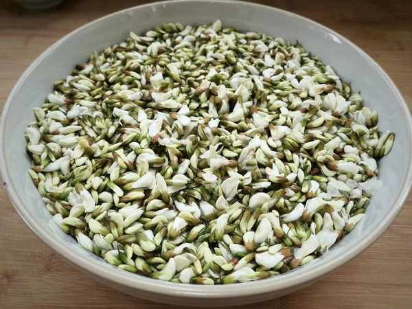 1、準備適量的槐花,槐花選擇半開不開的味道是最好,把花裡帶的葉子,小枝條全都去除,隻留下花朵就行,用清水多淘洗幾遍,控一控其中的水分。