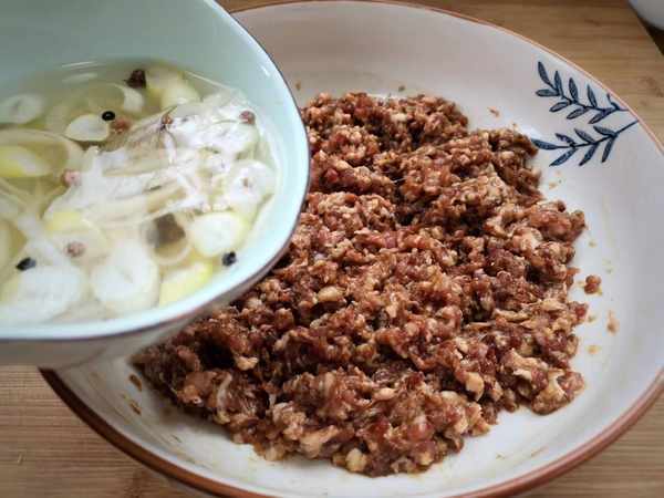 4、準備適量的大蔥成段,生薑切成薄片,少許花椒放入碗中,加入適量開水,浸泡10幾分鐘,釋放出蔥薑和花椒的香味,然後把蔥薑水分三次加入肉餡裡面。