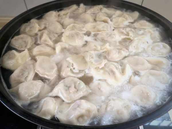 7、取適量餡放在皮中間,捏合捏緊包成餃子,鍋內加冷水燒開,撒入適量食鹽攪勻,下入餃子輕輕推散,再次燒開後,然後連續添3次冷水,直到最後一次燒開,看著餃子鼓肚,即可盛出裝盤食用。