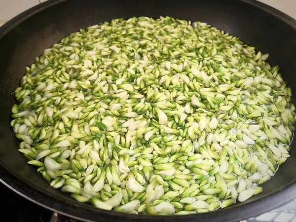 2、鍋裡放適量水,燒開以後放少許的鹽進去,然後再把槐花倒進去,焯水30秒左右,關火,槐花撈出來放到涼水的盆裡涼一下,然後攥幹水分。