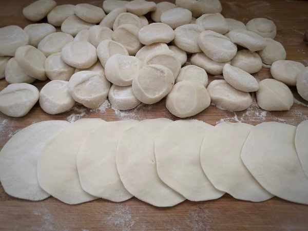 6、面團是我提前和好的,面團移至在案板上,揉搓整理成長條狀,然後分成大小適中的面劑子,將其搟成餃子皮。