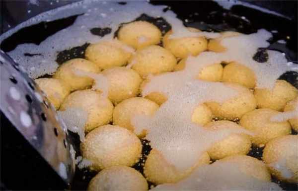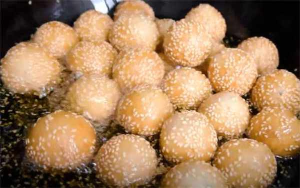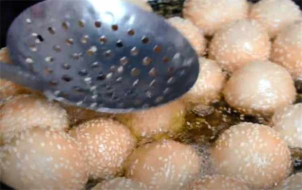 8.最後的時候開大火上色就行瞭,咱們這個麻團就已經炸好瞭。