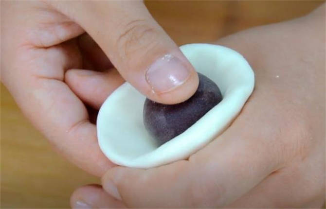 3.把這個面劑反復的揉勻按扁,然後再按成一個中間厚四周薄的小餅皮,中間放入一顆豆沙餡,利用虎口處這樣收起來。