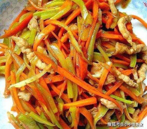 4.加入磨碎的胡蘿卜,炒熟。加入炒好的肉末拌勻。