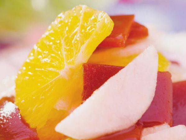 5 、把甜橙片、白梨片、山楂糕片放入大碗內,澆入調好的檸檬蜂蜜汁,充分調拌均勻入味,裝盤上桌即可。