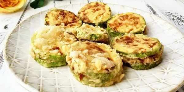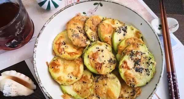 平底鍋刷油,油熱後把西葫蘆片裹上一遍面粉,然後粘雞蛋液,放進煎鍋中煎至兩面金黃即可出鍋。