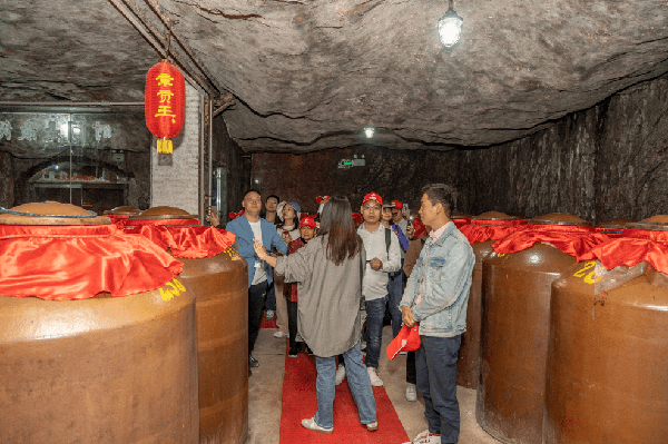 隨後,一行人來到中國唯一紅巖洞藏酒窖,據瞭解酒窖的主體是以紅巖為主,整個酒窖是恒溫恒濕,擁有穩定平衡的微型生態圈。酒窖全年溫度恒定20℃,濕度恒定80%左右,冬暖夏涼,空氣鮮潤,具有“天然冷濕庫”特點,是理想的藏酒場所,為酒類微生物繁衍提供瞭優質的環境。