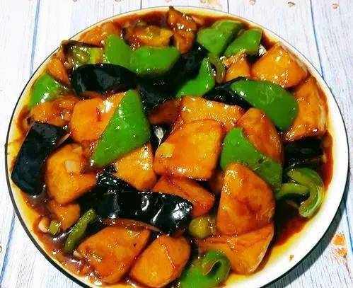 1、茄子連皮切圓片,土豆切0.3厘米厚,青椒切三角形。