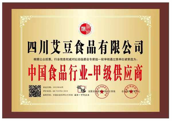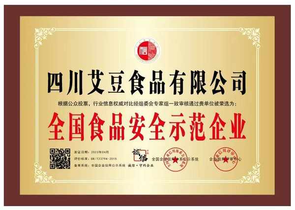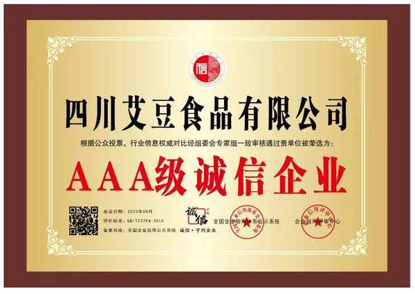 目前,艾豆食品先後榮獲全國食品安全示范企業、中國食品行業甲級供應商、AAA誠信企業等榮譽,艾豆食品的誠信與服務,如標桿一般領導著行業健康發展。
