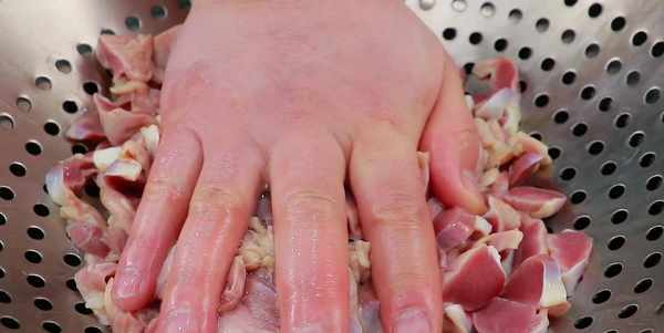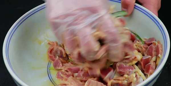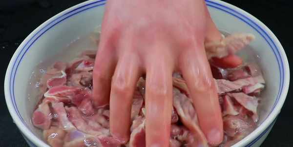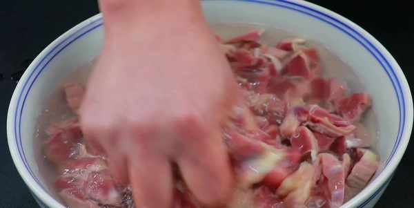 切好以後放到大碗裡,加水抓洗一下,這樣能洗掉血水,達到一個初步去腥的作用,換水多清洗幾遍,洗至水變清澈就可以瞭。洗幹凈以後倒出控水,把裡面的水分擠幹一些