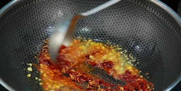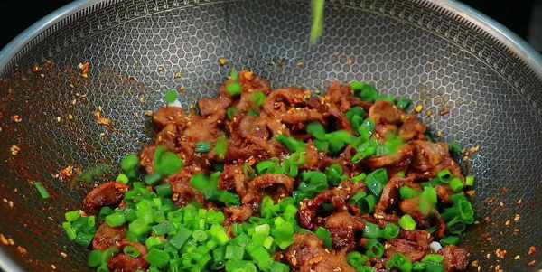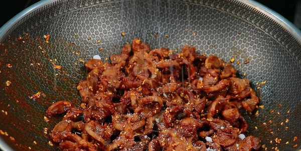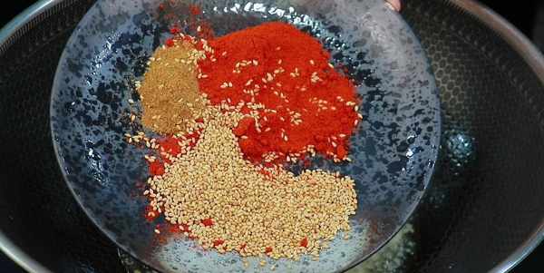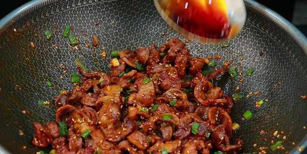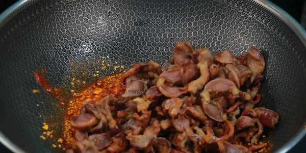 鍋留底油,先下入蒜沫炒香,在加入孜然粉、辣椒面和白芝麻,小火慢炒,炒出紅油,註意控制火候不要炒糊瞭。接著把雞胗下鍋,快速的翻炒一下,讓雞胗能夠裹滿香辣孜然味。醃制的時候,鹽味已經放夠,調味隻需要放少量白糖,加入小蔥花,開大火快速炒勻,出鍋前放一點香辣紅油