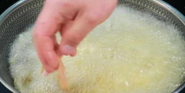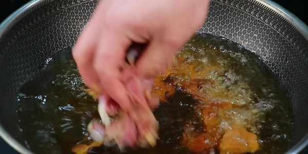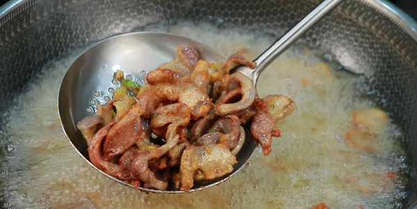 醃好以後挑去蔥薑,四成油溫散開下鍋,下鍋以後先不要攪動,讓雞胗定型,完全定型以後再用漏勺打散,大約炸兩分鐘雞胗金黃酥脆就可以瞭,炸好以後撈出控油,感覺表面不夠酥脆的,可以再復炸一次