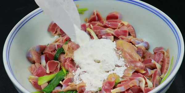 接著往裡面加入半個雞蛋,一些玉米淀粉抓勻,雞蛋可以讓雞胗吃起來更酥脆,淀粉可以封鎖水分,這樣吃起來更鮮嫩一些,抓勻以後醃制十五分鐘