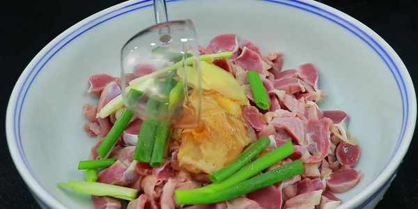 接下來醃制,加入蔥薑、鹽,胡椒粉,料酒去腥,放少量生抽,然後用力的抓一下,把蔥薑裡的汁水抓出來,這樣去腥效果更好,雞胗也能入味