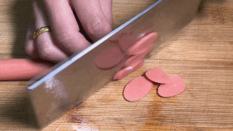 2. 剝去外皮的火腿腸一根,斜刀切成薄片