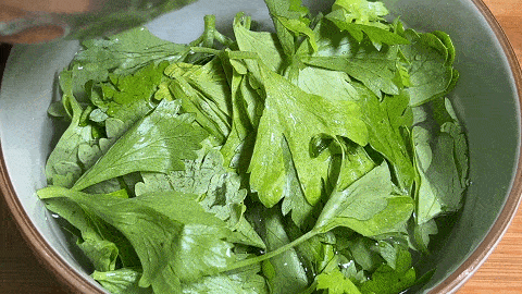 1. 將洗凈的芹菜葉放入裝有清水的大碗中,加入食鹽浸泡2分鐘