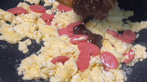 6. 用鏟子炒成細小的雞蛋塊,將火腿腸倒入鍋內,用鏟子翻炒