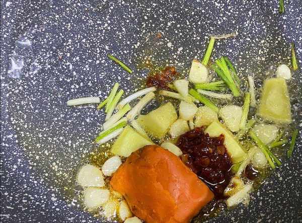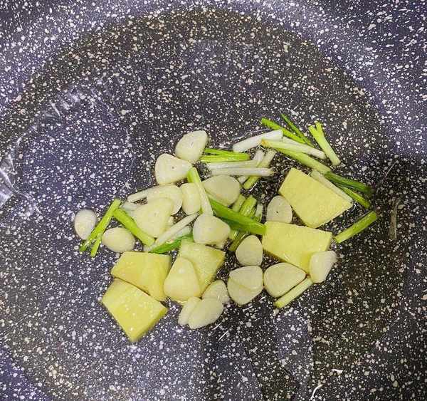 步驟二:鍋中燒熱油,油開下入蔥薑蒜爆香。