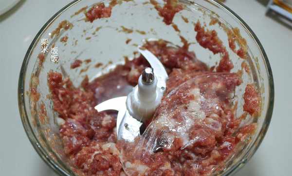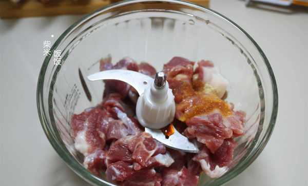 5,豬前腿肉洗凈,切成小塊放在料理機裡。加鹽、少許白糖、雞精、生抽、花椒水(一斤肉30~50克花椒水),絞成肉丁。