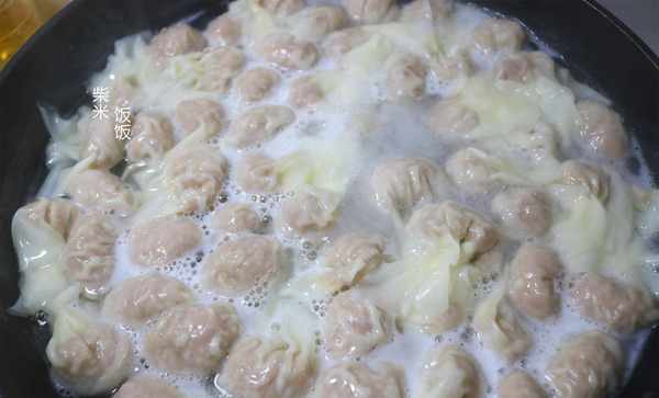 9,包好的餛飩水開下鍋煮,用鏟子沿著鍋底推動防止粘連。再次煮沸淋入半碗涼水,煮至餛飩全部漂浮起來,肉餡膨脹變大,面皮變得透明即可關火撈出。