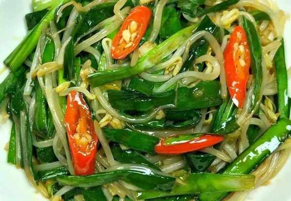 1、韭菜清洗幹凈切成小段,綠豆芽清洗幹凈,小米辣斜切成片。
