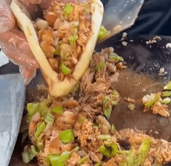 第2天出攤的時候,再把鹵好的肉,放在不銹鋼鍋裡,帶著湯汁出攤,客人點單之後把肉撈出,放在菜板上剁碎。還要加上青辣椒來解膩。