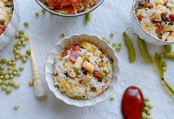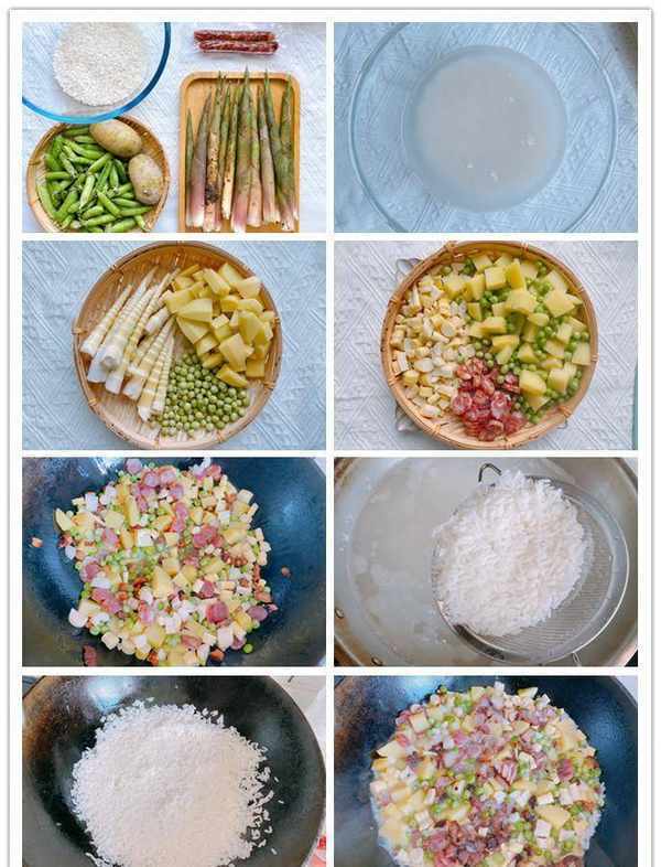 1、先準備需要的原材料,大米、野筍、豌豆、土豆和香腸,食材的比例沒有固定的要求,根據自己的喜好決定,葷素搭配能讓立夏飯的營養更豐富。
