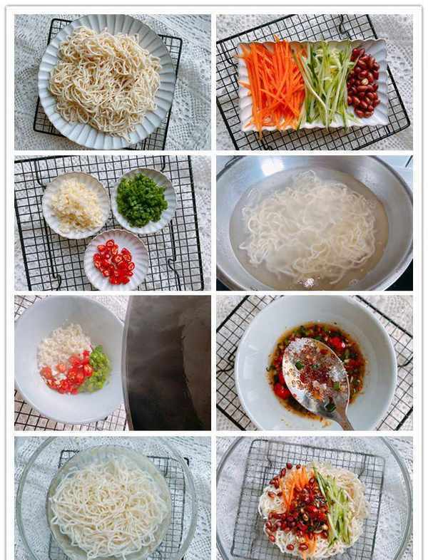 【原材料】面條、黃瓜、胡蘿卜、花生米、陳醋、生抽、老抽、食用油、白糖、蔥花、白芝麻、雞蛋;
